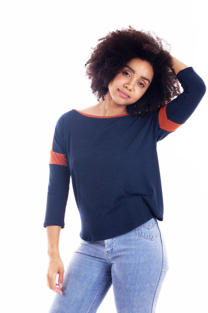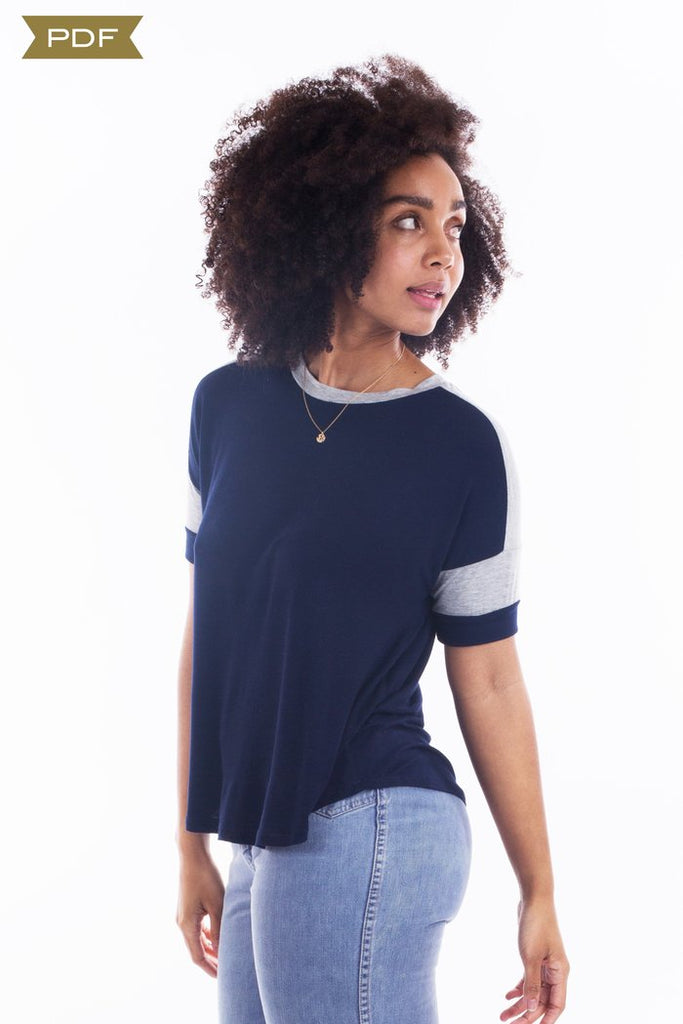 Due to its wide, oversized body width, the Merlo is most flattering when sewn in a drapey knit fabric such as rayon, bamboo or Tencel knits. Cotton and linen knits also work but may result in a slightly boxy look. The contrast stripes are perfect for using up precious knit fabric left-overs. The pattern also offers two neckline choices and three sleeve length options.
